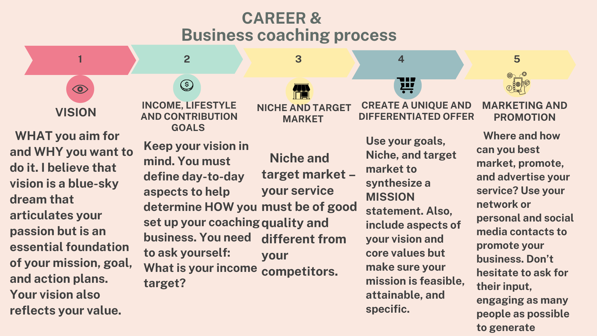 In order to assist my clients build a successful business, I've put together the following 5 stages. The following steps will be taken as part of this coaching partnership